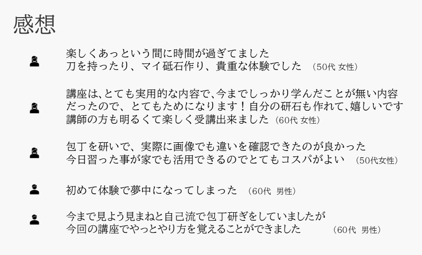 - 包丁研ぎ体験で使用する包丁は、こちらでご用意します。3名1グループで順番に体験いただけます。